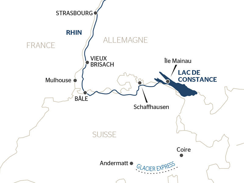 France, Suisse et Allemagne : croisière sur le Rhin vers la région des 3 pays et voyage à bord du train "Glacier Express" (formule port/port)